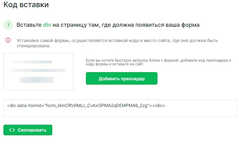 Перейдите на вкладку «Код вставки». Скопируйте текст из окна DIV для установки формы и скрипт для ее вызова, вставьте на сайт
