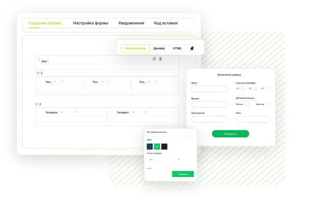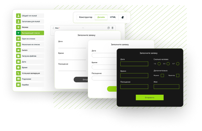 Функционал сервиса позволит быстро создать и настроить обратную связь под нужные цели. Панель инструментов содержит все нужные элементы и типы полей форм: текстовые и числовые строки, выбор даты и времени, выпадающие списки и остальное. Использовать формы обратной связи, сделанные на конструкторе можно и без сайта