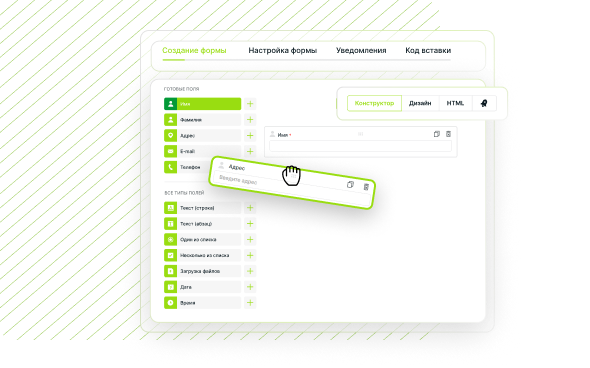 Перетаскивание блоков — простейший способ сделать любую форму за пару секунд в удобном редакторе. Готовый результат встраивается в нужное место сайта одним простым кодом