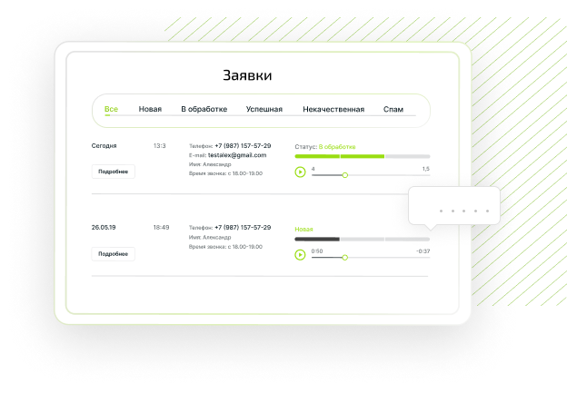Пользователи оставляют на сайте заявки, которые можно обрабатывать во внутренней мини-CRM. В приложении есть статусы обработки заявок и возможность комментирования, разделения прав доступа. Организовать работу менеджеров и ведение базы данных клиентов можно без сторонних программ