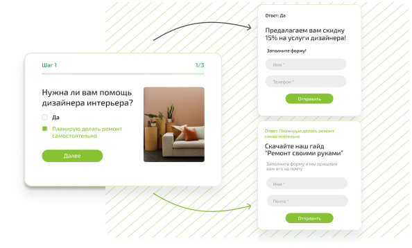 Настройте конечный этап квиза в зависимости от ответов. Выбирайте, что получит пользователь — промокод, скидку, отправку заявки или просто результат опроса