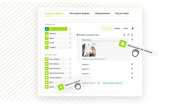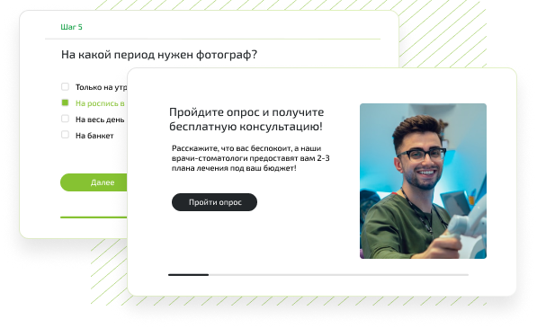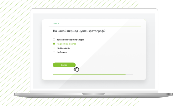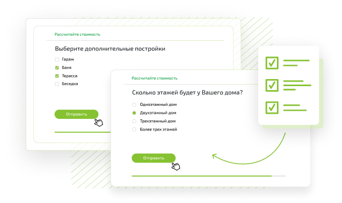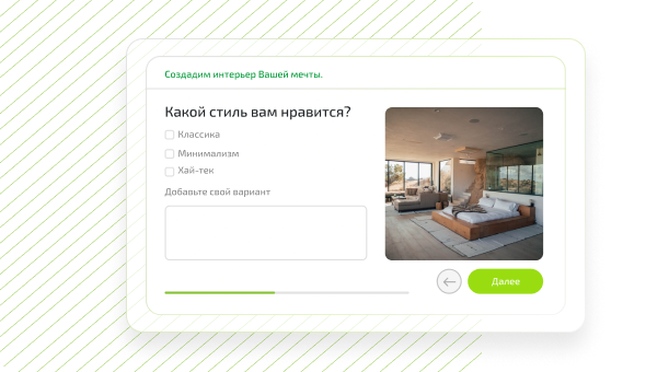 Сервис квизов для сайта Qform создает интерактивную форму под любые ваши запросы. Квиз — это удобный веб-инструмент, который помогает вовлекать аудиторию во взаимодействие, определяться с выбором и изучать их потребности. Посетитель отвечает на вопросы и оставляет заявку с входными данными