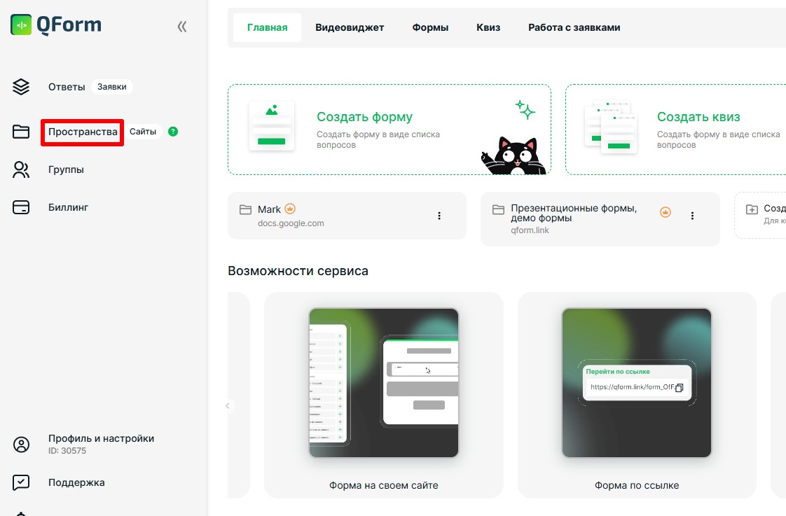 Войдите в свой аккаунт QForm и перейдите в Пространства .
