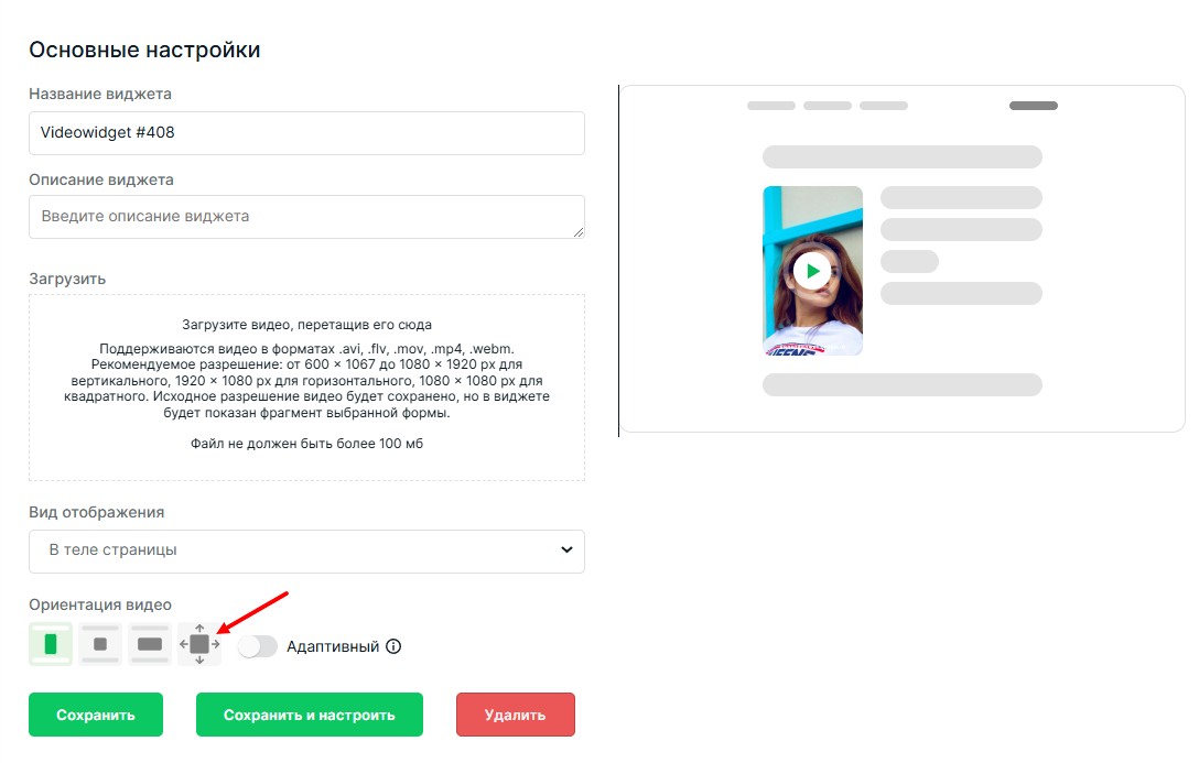 Затем определитесь с ориентацией (вертикальный, квадратный, горизонтальный) и включите свойство адаптивности. Тогда видео заполнит всю ширину родительского элемента и сохранит пропорции