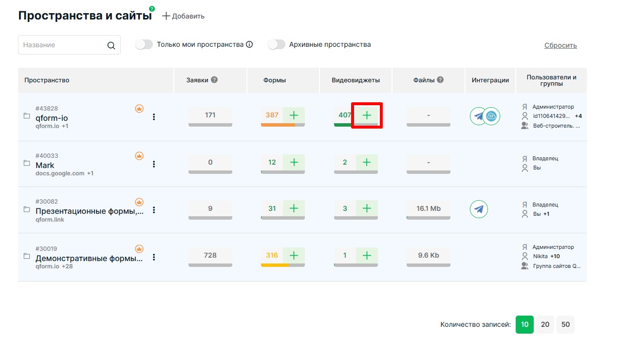 Перейдите в «Пространства и сайты», нажмите «+» напротив нужного пространства.