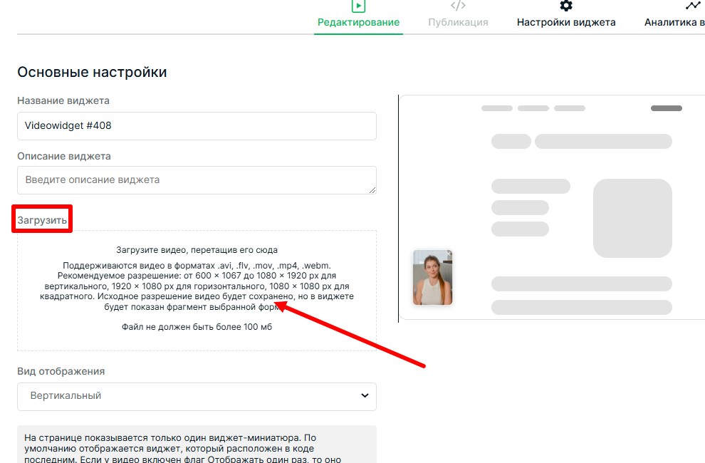 В появившемся меню "Редактирование", перетащите видеофайл (формат mp4, avi, flv, mov, webm) в поле загрузки.