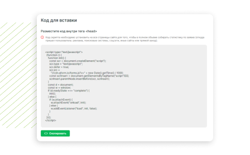 Перейдите в раздел «Публикация», затем во вкладку «Вставить код на сайт». Скопируйте скрипт и вставьте в на каждой странице сайта, где будет работать виджет. Затем скопируйте код виджета и вставьте его в .